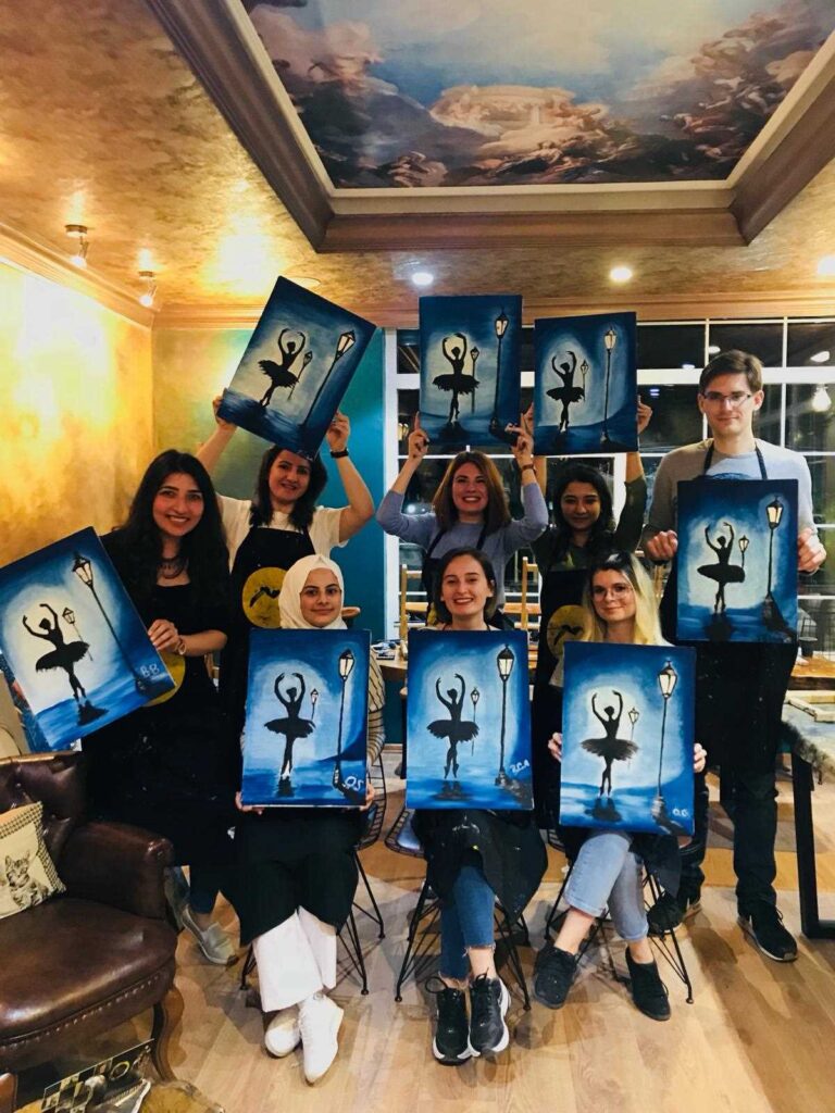 Bu etkinlikte katılımcılarımız hem fırçaları ile yaratıcılıklarını deneyimler hem de resim yapmanın renklerle terapi tadında unutamayacakları bir tecrübe yaşarlar. Yetenekli ya da deneyimli olmaya gerek yok. Bu harika deneyimde önemli olan keyif almak ve sosyalleşerek güzel vakit geçirmek.