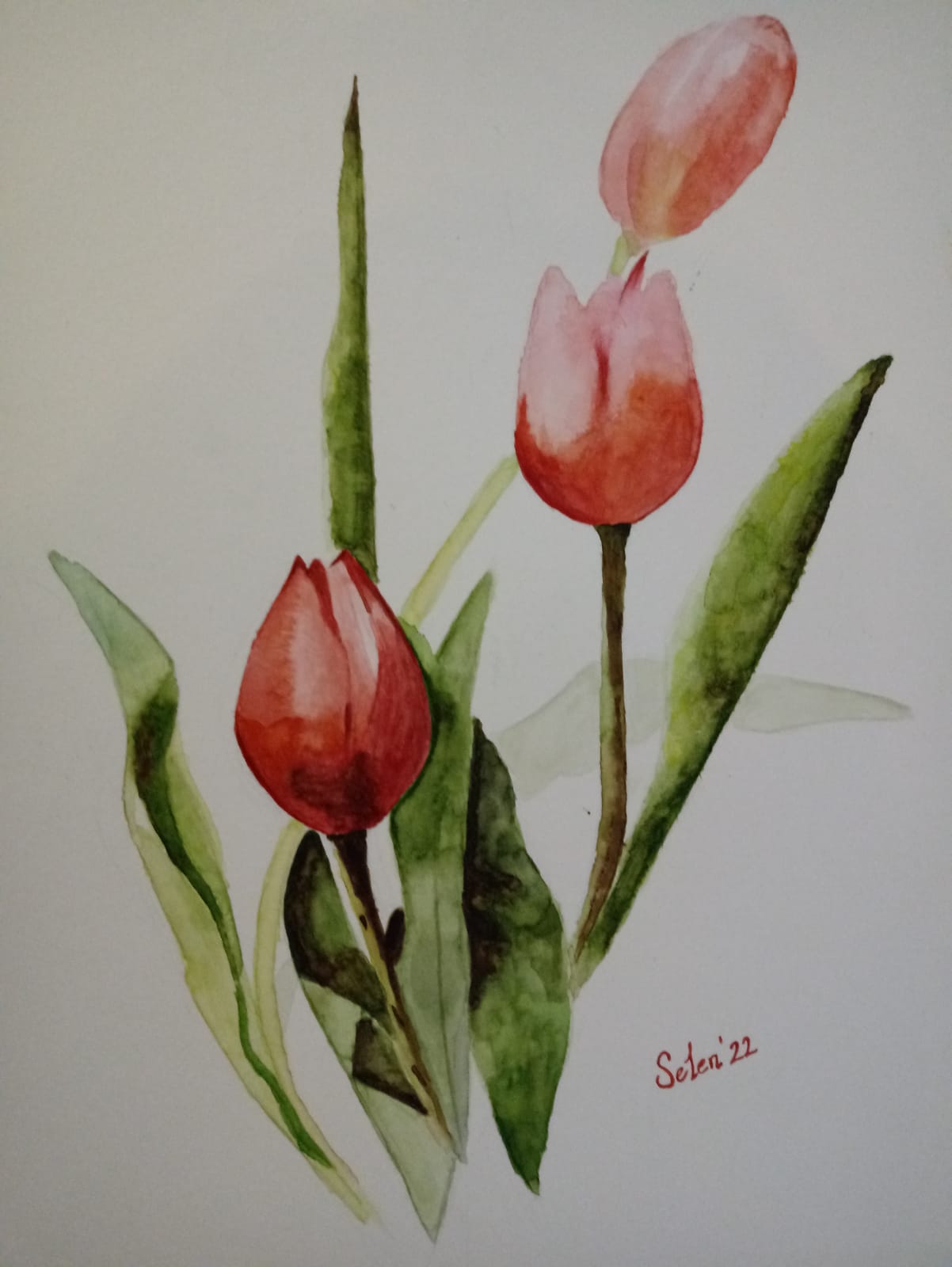 Kırmızı ve pembe lalelerin narin duruşunu sulu boyanın yumuşaklığıyla birleştiren bir çalışma. Yeşil yaprakların arasından yükselen çiçekler, baharın taze ve romantik ruhunu mekana taşıyor.