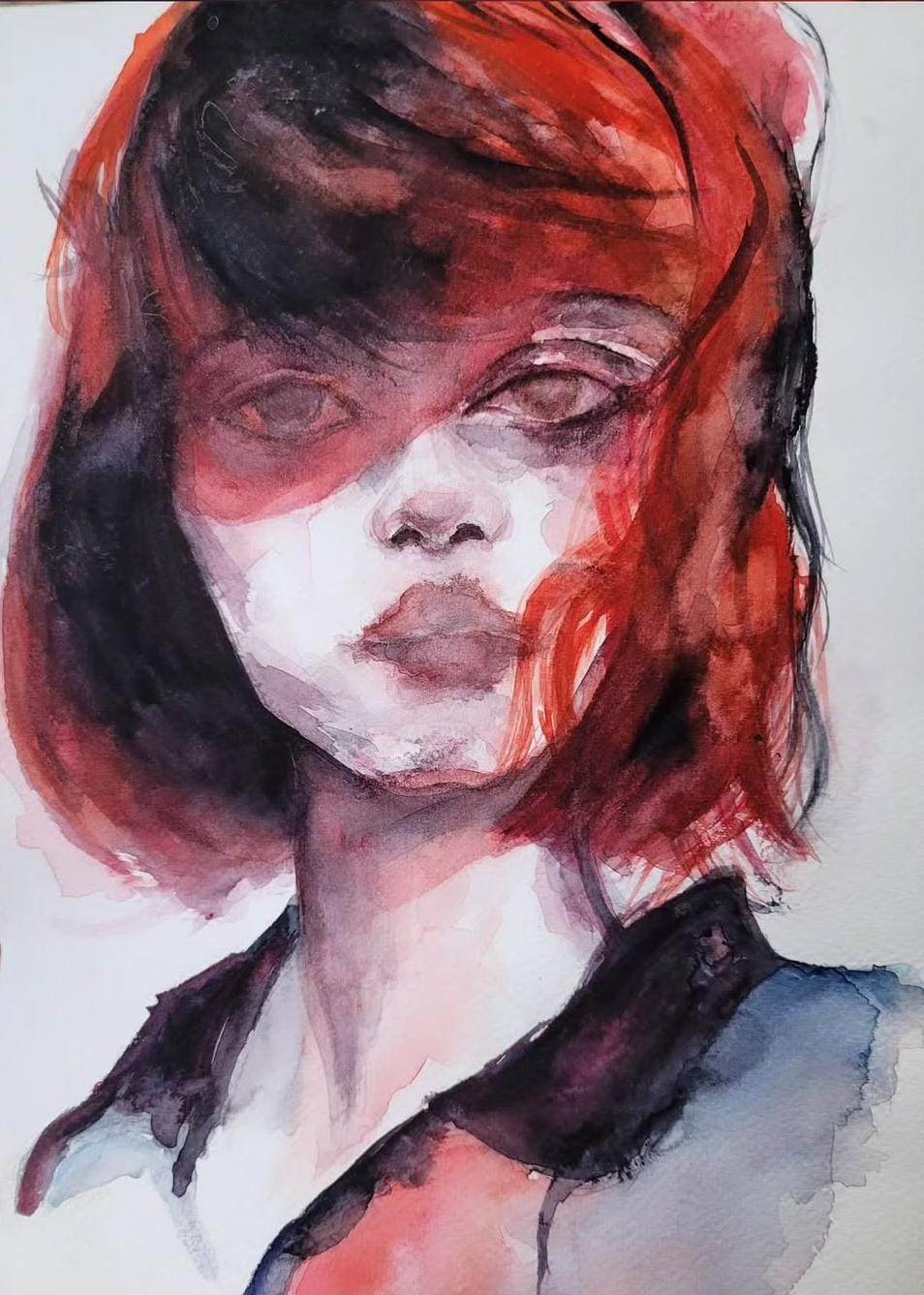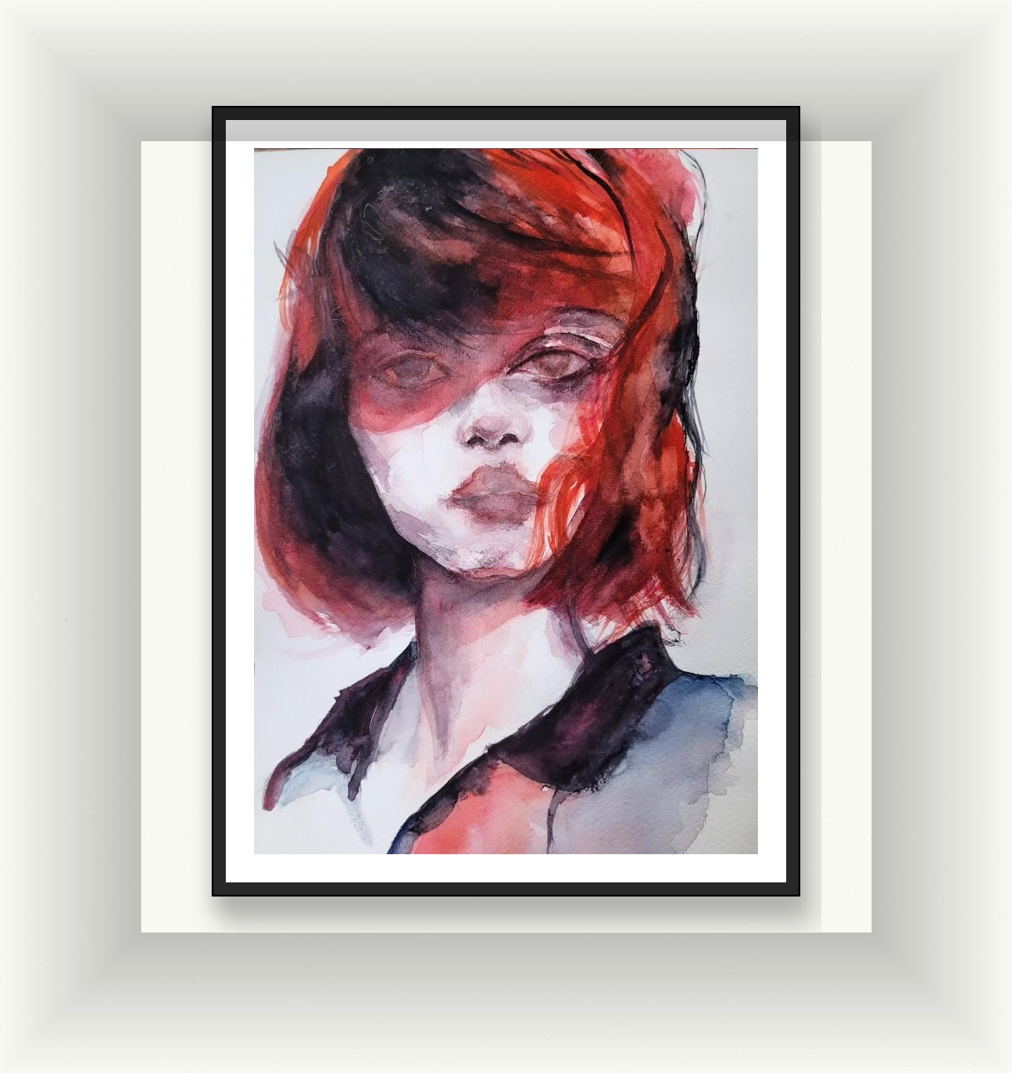 Kırmızının koyu ve yoğun tonlarıyla hayat bulan bu buğulu suluboya portre, tutkunun ve gizemin estetik bir yansımasıdır. Dağılan pigment geçişleri figüre romantik bir sis etkisi kazandırırken, koyu kızıl tonlar güçlü ve çarpıcı bir enerji yaratır. Yüz hatlarının yarı belirsizliği izleyeni hikâyenin içine çeker; her bakışta farklı bir duygu keşfedilir. Bu eser, feminen gücü ve içsel ateşi zarif bir kompozisyonla buluşturur.