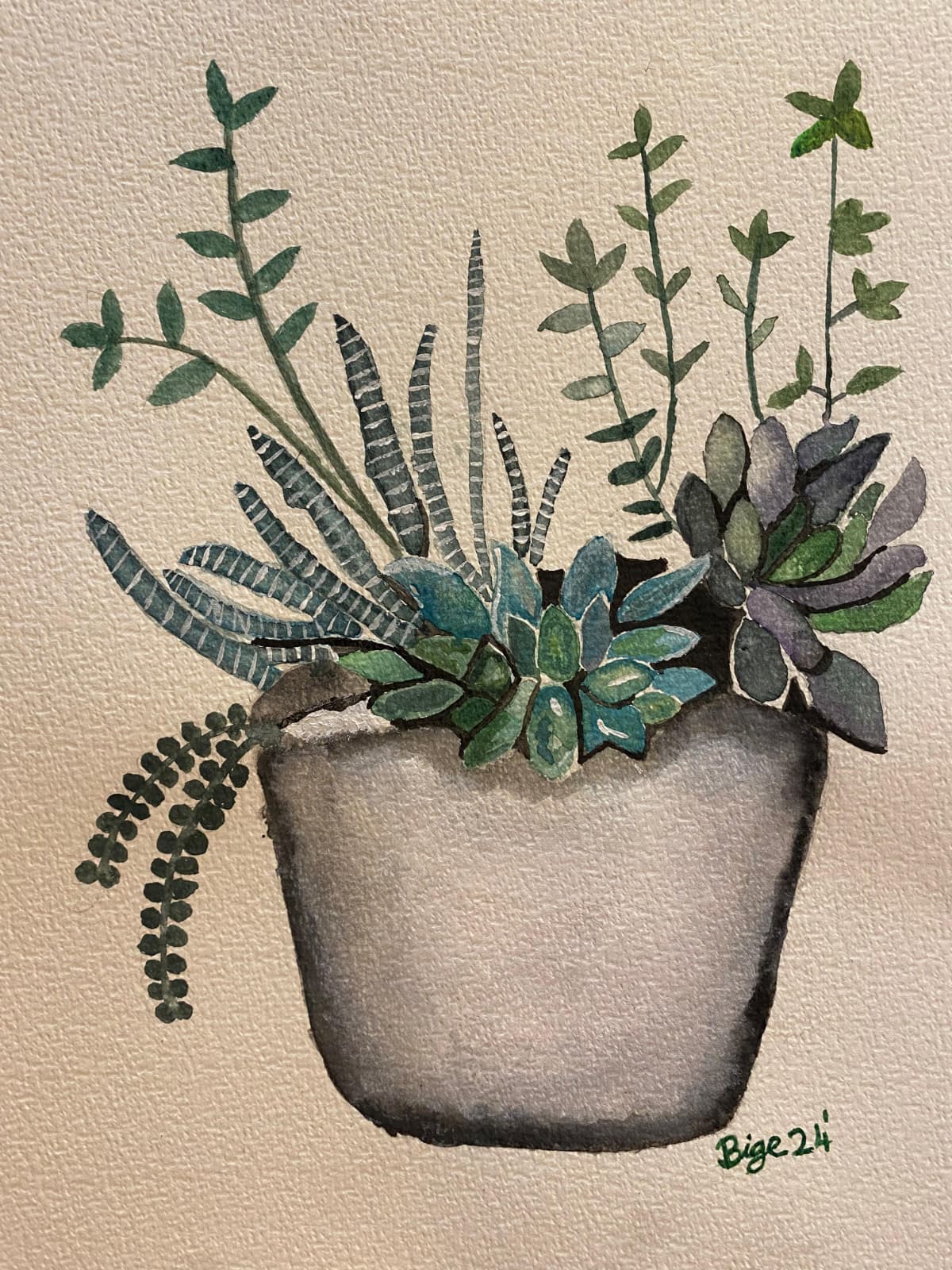 Yeşilin ve morun en doğal tonlarıyla hayat bulan, farklı formdaki sukulentlerin bir araya geldiği bir suluboya çalışması. Gri saksının sade yapısı, bitkilerin detaylı dokusunu ve renk geçişlerini ön plana çıkarıyor. Taze ve huzurlu bir hava yansıtan bu eser, kağıt üzerindeki suyun doğal yayılımıyla hayat buluyor.