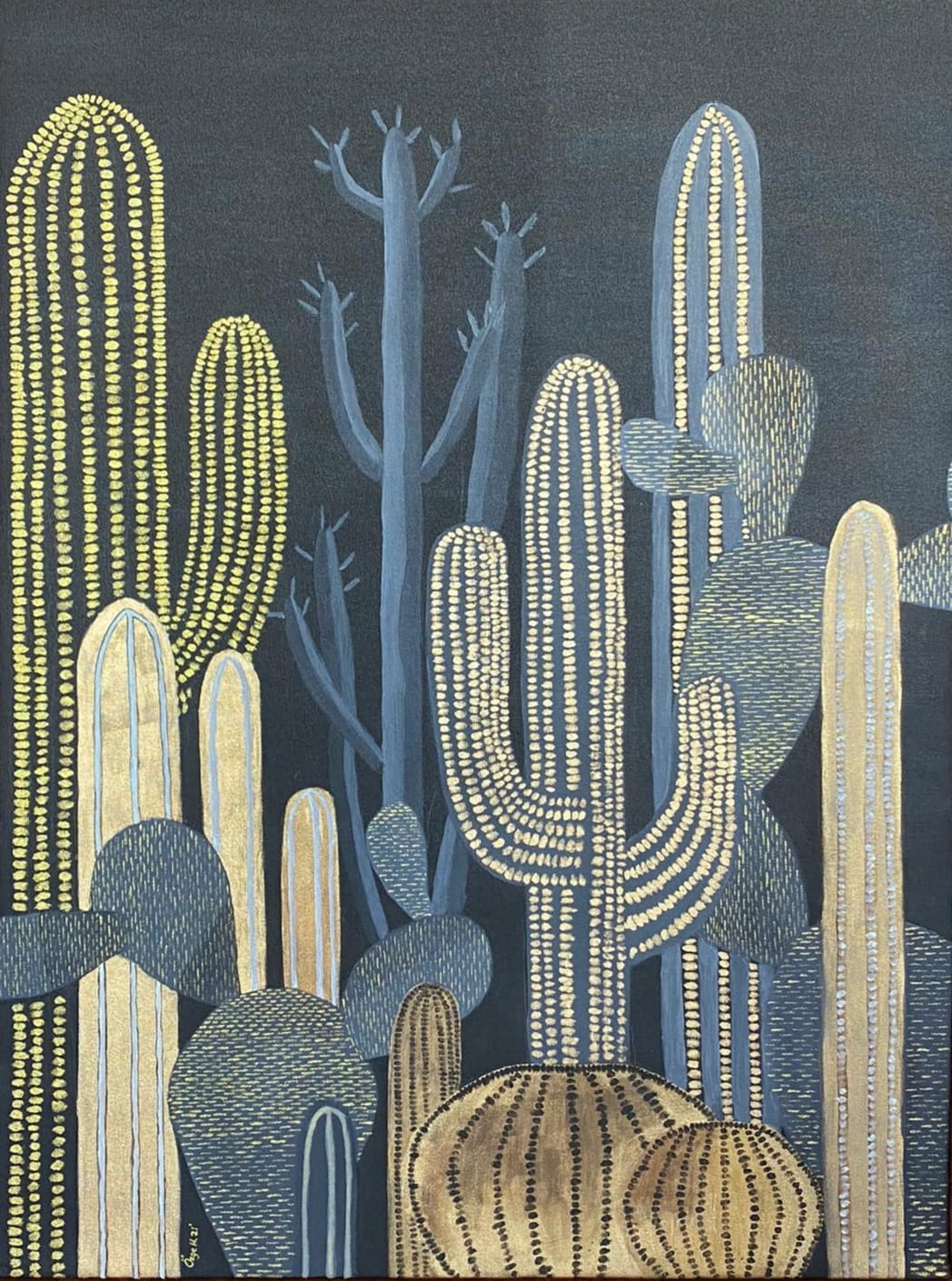 Koyu lacivert zemin üzerinde altın ve gümüş parıltıları andıran detaylar. Noktalama tekniğiyle oluşturulan dokular, bitki formlarına modern ve dekoratif bir yorum getiriyor.