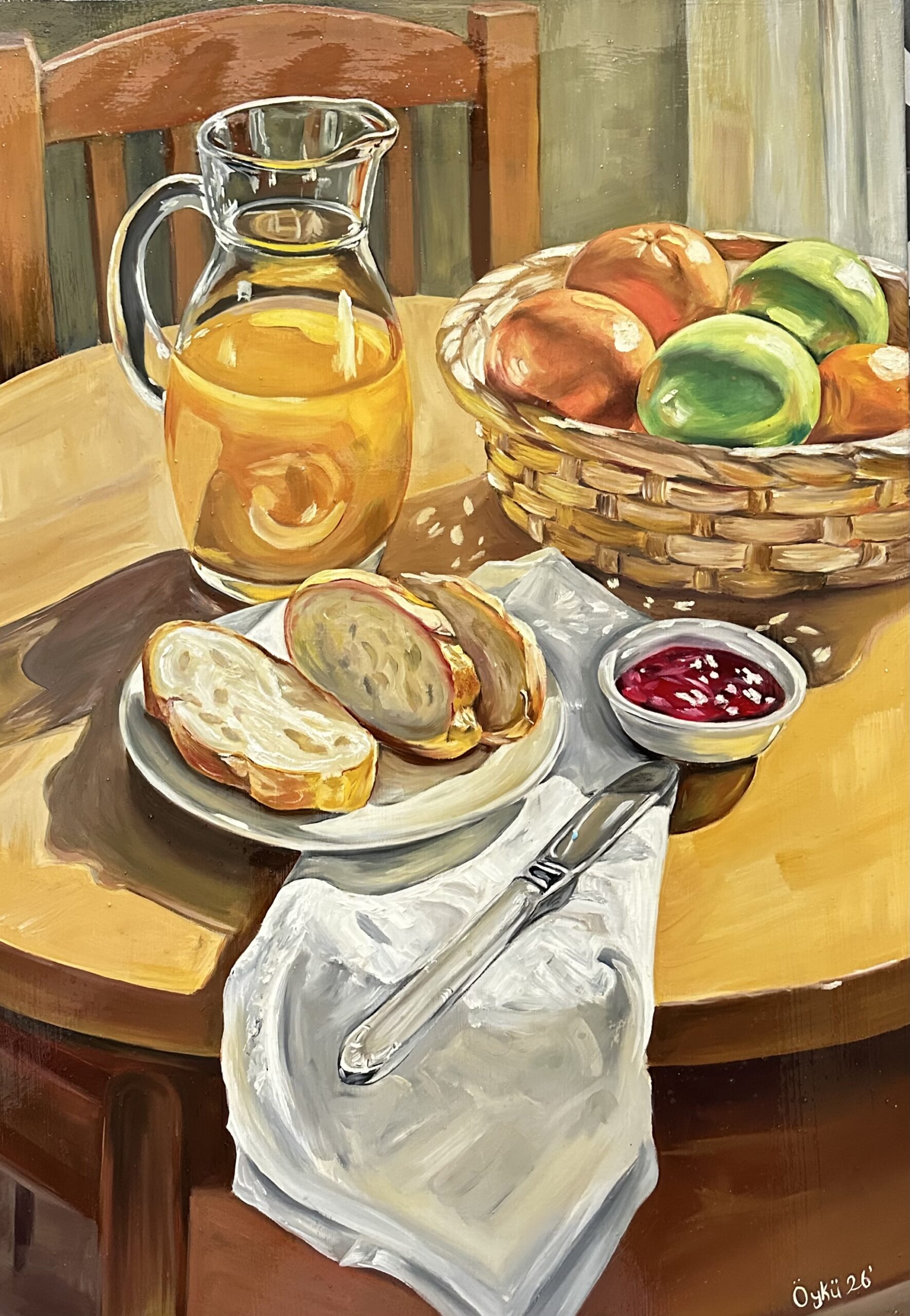Gün ışığının ahşap masa üzerine bıraktığı sıcak tonlar, cam sürahideki zeytinyağının parlaklığı ve taze ekmek ile meyvelerin doğal renkleri bu yağlı boya natürmorta sakin ve samimi bir atmosfer kazandırır. Günlük hayatın huzurlu bir anını hatırlatan bu eser, bulunduğu mekâna sıcaklık ve karakter katmak için ideal bir parçadır. Salon, yemek alanı, mutfak, kafe ya da butik restoran gibi yaşam ve paylaşımın olduğu alanlarda dekoratif bir odak noktası olarak kullanılabilir. 🎨