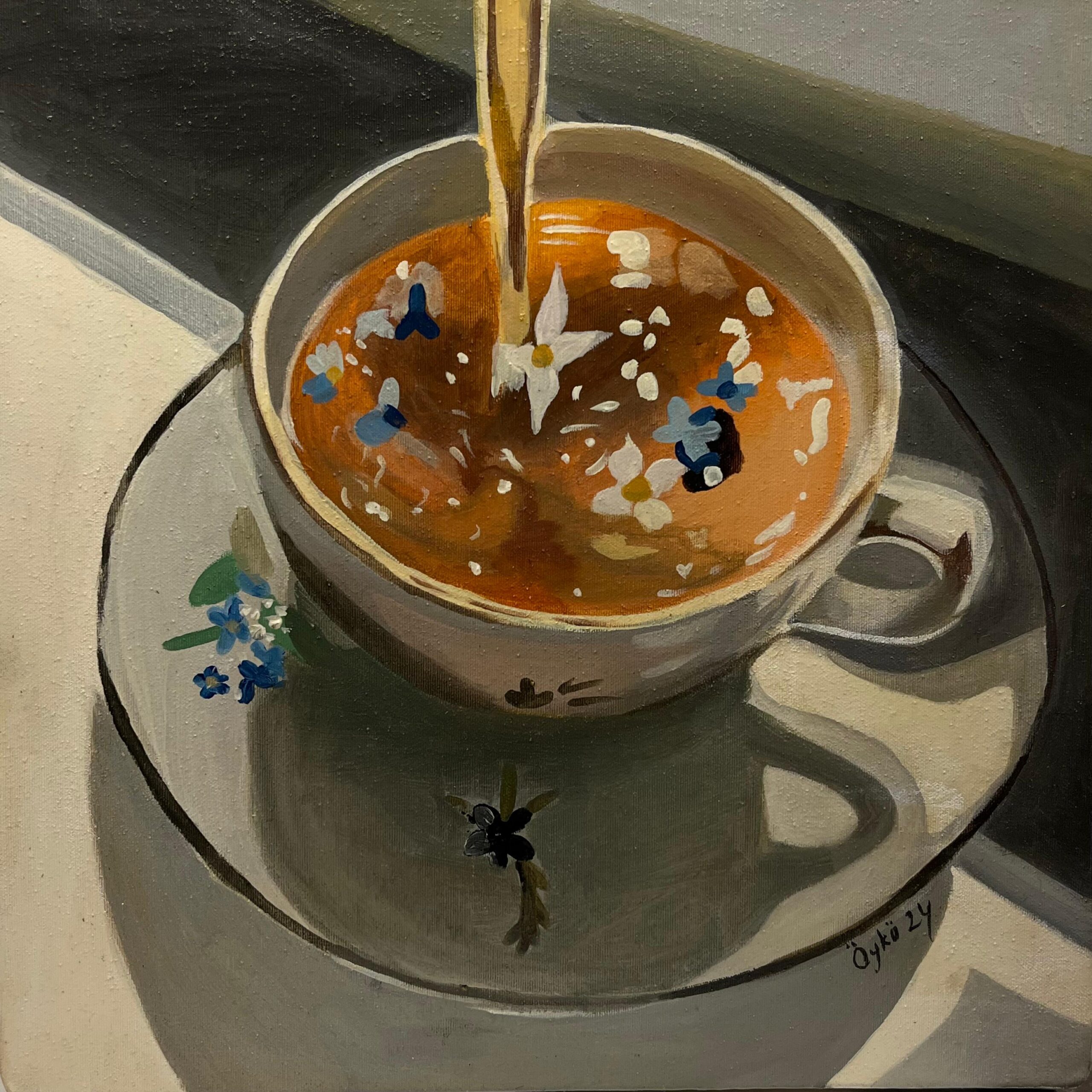 Fincana dökülen sıcak akış ve yüzeyde zarifçe süzülen çiçekler… Bu eser, gündelik bir anı estetik bir ritüele dönüştürüyor. Yumuşak ışık, sade kompozisyon ve modern dokunuşlarıyla bulunduğu mekâna ferah, şık ve huzurlu bir atmosfer kazandırır.
