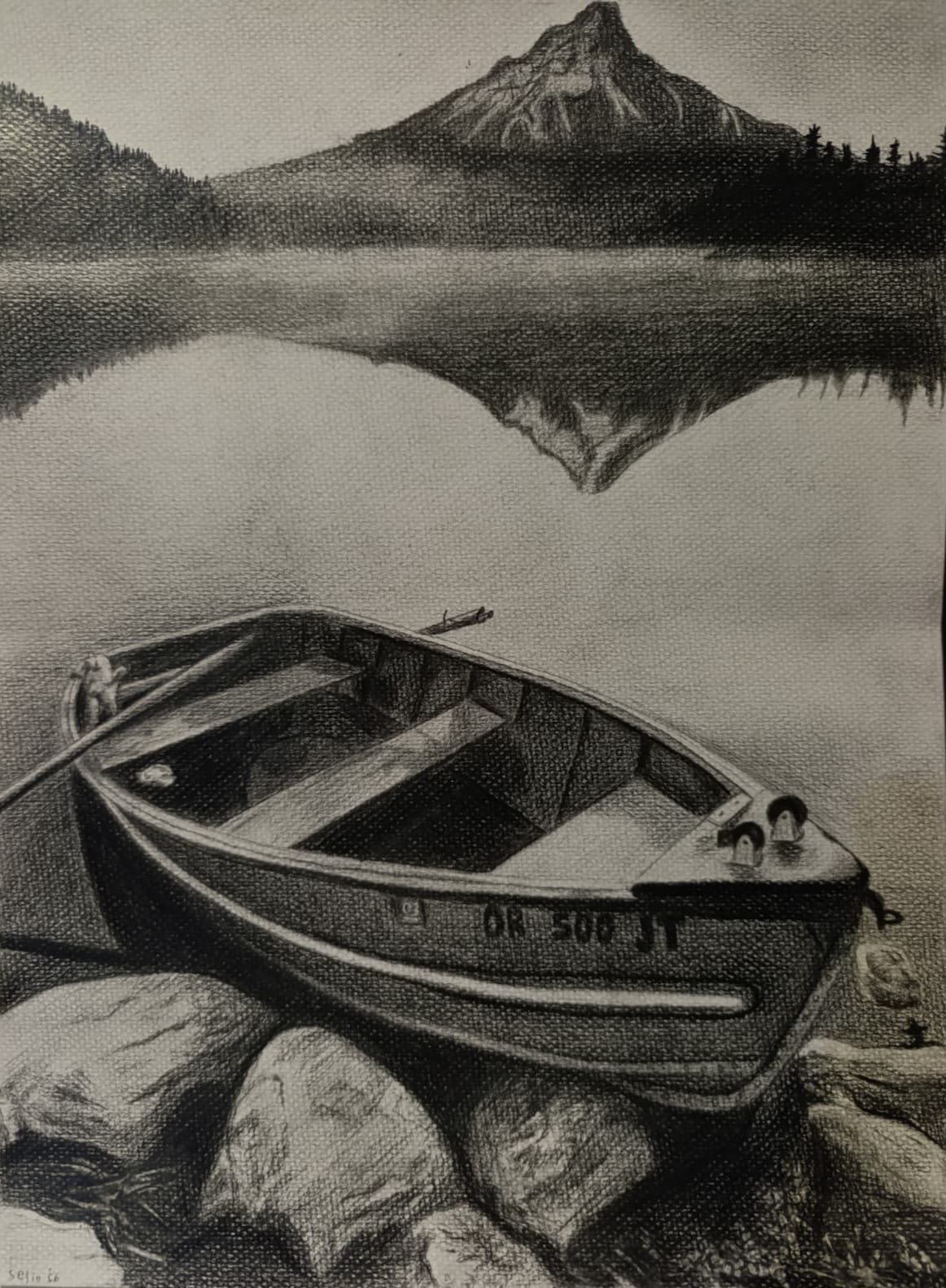 Klasik bir manzaranın karakalem yorumu. Dağın göle yansıması ve ön plandaki kayığın dokusu, geleneksel sanatseverler için zamansız bir parça sunuyor.