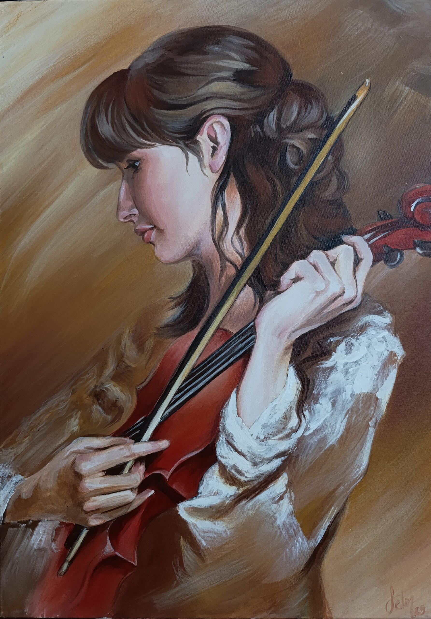 Bu portre çalışması, sadece bir müzisyeni değil, sanatçının enstrümanıyla kurduğu o derin ve mahrem bağı konu alıyor. Sanatçı, eserde sepya ve toprak tonlarını baskın kullanarak zamansız, nostaljik bir atmosfer yaratmış. Arka plandaki flulaştırılmış, dinamik fırça darbeleri, kemandan yükselen görünmez notaları ve müziğin yarattığı duygusal dalgalanmayı simgeliyor.