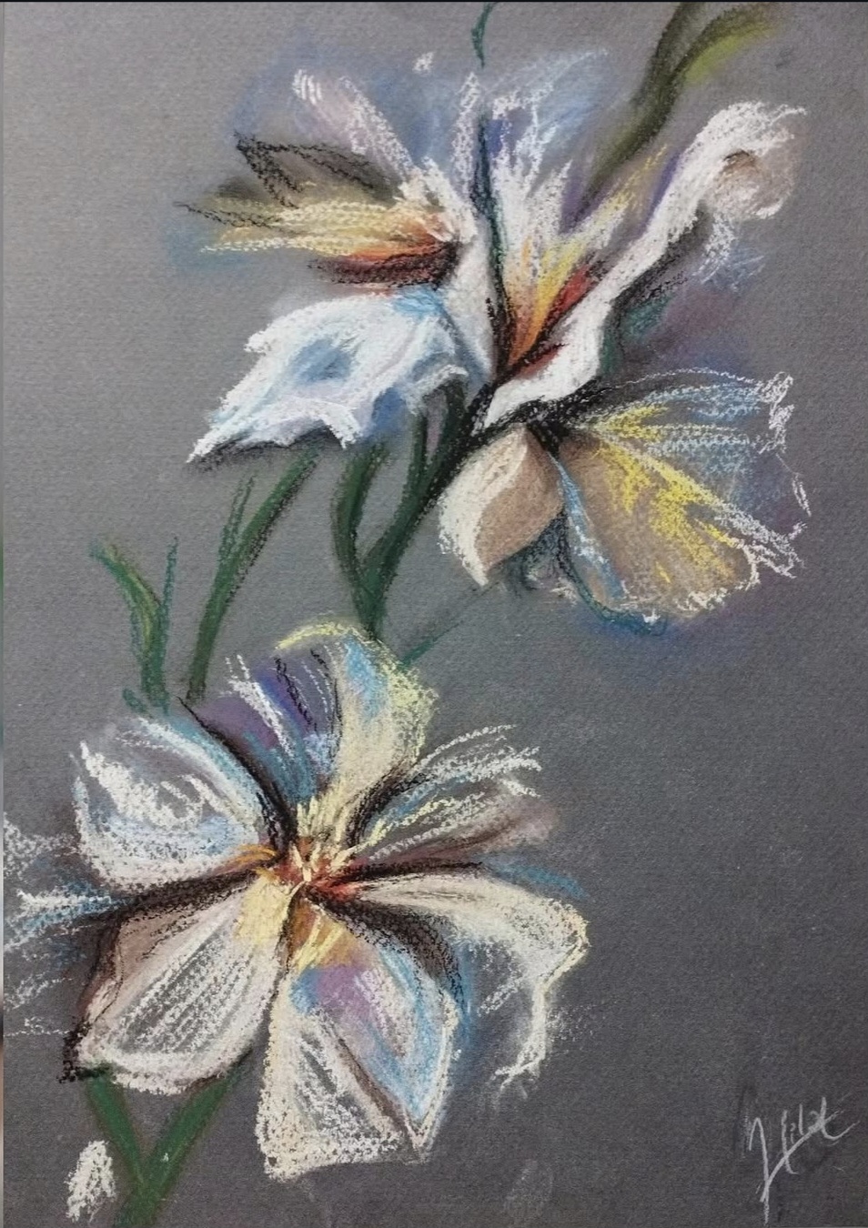 Soft pastel teknikle yapılmış, yumuşak dokulu bir çiçek çalışması. Koyu gri zemin üzerindeki beyaz ve sarı tonları, yapraklara doğal bir canlılık veriyor. Salon duvarında, yatak odasında veya antredeki dresuarın üzerinde taze ve sakin bir görüntü arayanlar için uygun bir parça.