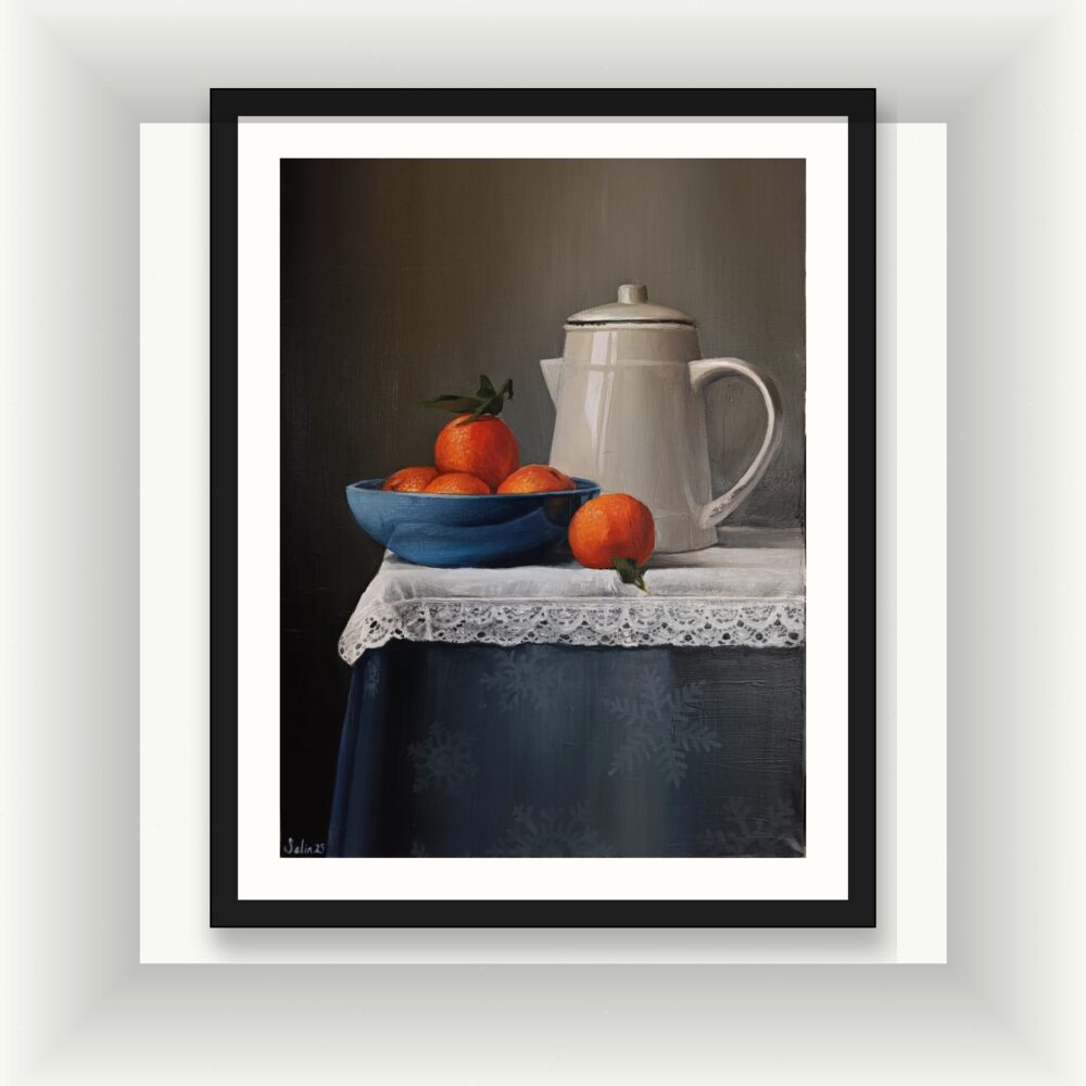 Bu yağlı boya çalışma, izleyiciyi bir sabahın dinginliğine ve sadeliğine davet ediyor. Sanatçı, beyaz porselen demliğin pürüzsüz yüzeyi ile mandalinaların gözenekli kabuk dokusu arasındaki kontrastı mükemmel bir ustalıkla işlemiş. Kompozisyonun en dikkat çekici unsuru olan lacivert seramik kase, mandalinaların parlak turuncu tonlarını (komplementer renk kullanımıyla) adeta patlatıyor.