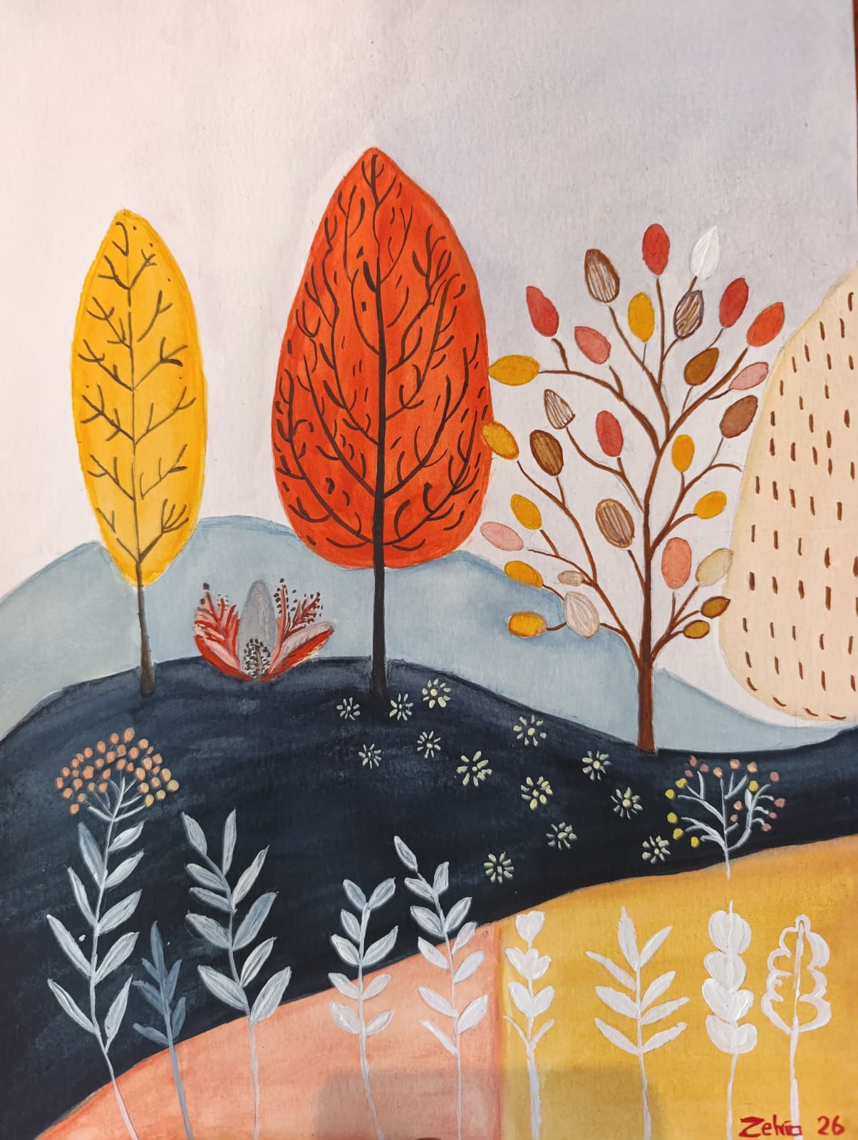 Hayal gücünüzün sınırlarında bir gezintiye çıkın. Bu modern çalışma, sonbaharın sıcak renklerini stilize edilmiş formlarla birleştirerek evinize masalsı bir hava katıyor. Hardal sarısı, kiremit rengi ve derin lacivertin uyumu, doğanın ritmini modern bir dille anlatıyor. Her baktığınızda sizi başka bir hikayeye davet eden, genç ve dinamik bir eser.”