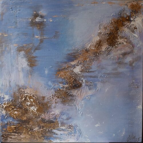 Bu soyut kompozisyon, sanatçının impasto ve kazıma tekniklerini bir arada kullanarak oluşturduğu müthiş bir doku şölenidir. Tuval üzerindeki açık mavi ve beyaz geçişler, uçsuz bucaksız bir gökyüzünü veya dingin bir su yüzeyini andırırken; diyagonal olarak uzanan altın sarısı ve kahverengi yoğun katmanlar, toprağın ham enerjisini temsil ediyor.