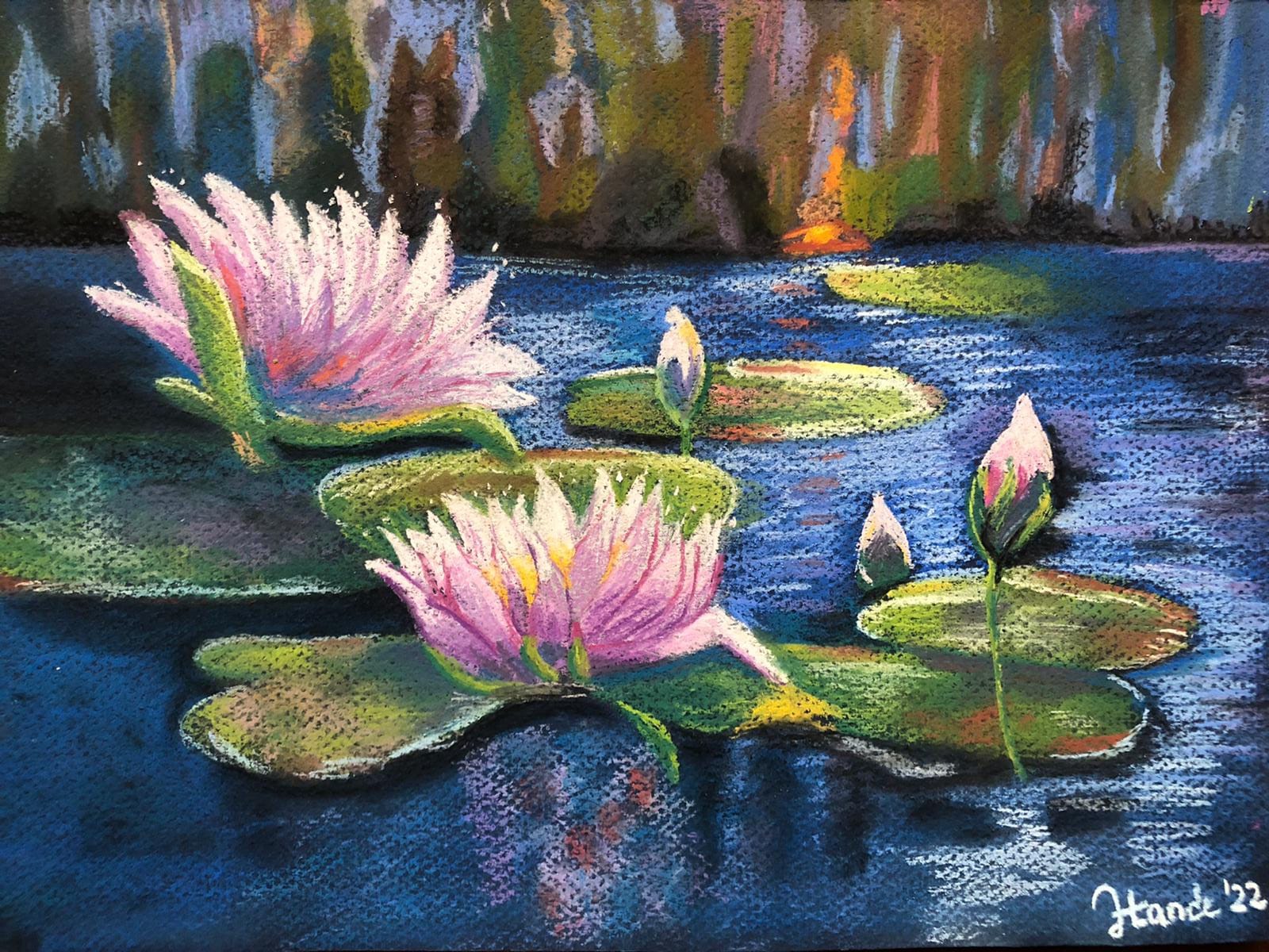 Nilüferlerin su üzerindeki zarif duruşunu canlı renklerle betimleyen bir çalışma. Doğanın renk paletini tüm canlılığıyla hissettirir.
