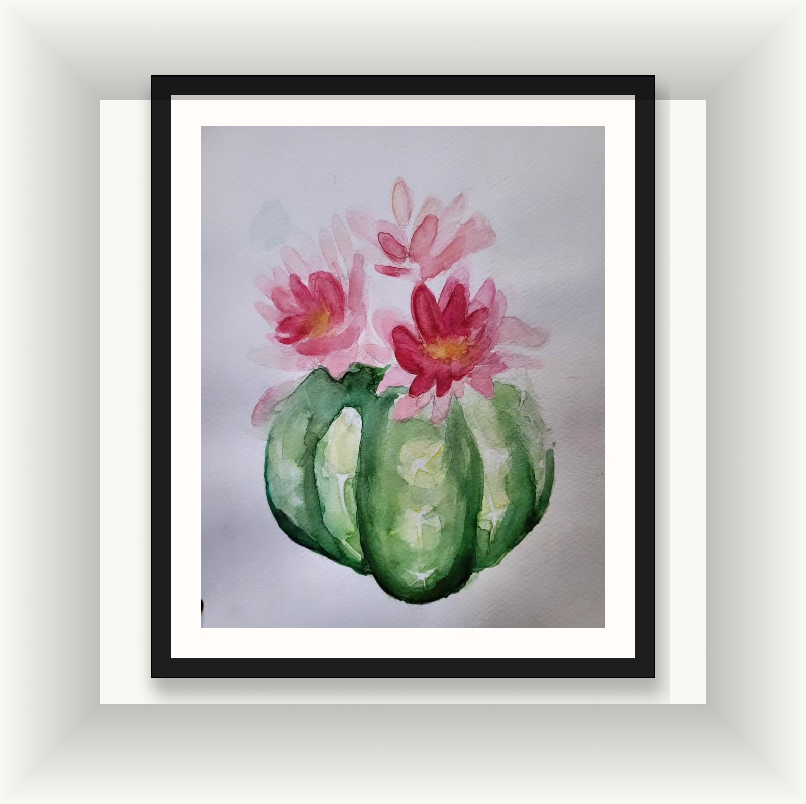 Yeşilin güçlü formu ile pembenin narinliği… Bu suluboya çalışma, kaktüsün dayanıklılığını ve çiçeklerin zarif enerjisini aynı kompozisyonda bir araya getiriyor. Yumuşak renk geçişleri ve beyaz fonun ferahlığı, tabloya modern ve minimal bir karakter kazandırıyor.