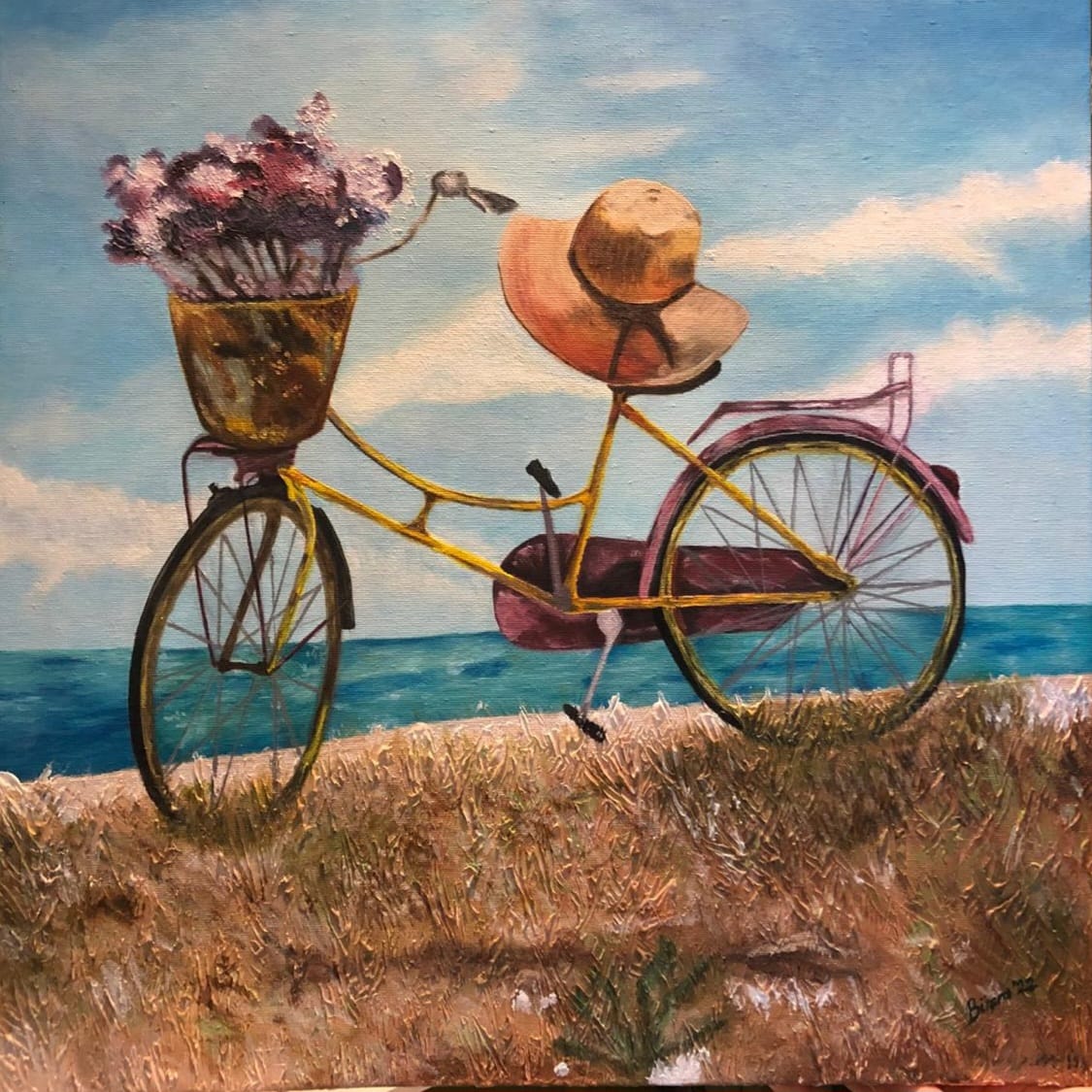 Sepeti çiçeklerle dolu, şapkası üzerine iliştirilmiş sarı bir bisiklet ve arkada uzanan uçsuz bucaksız deniz. Tatil neşesini ve özgürlüğü hatırlatan, dokulu fırça darbeleriyle zenginleştirilmiş bir manzara.